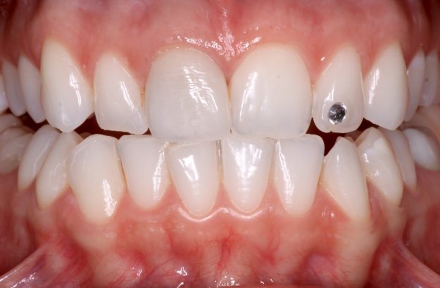 Paciente de 28 años que acude a la consulta por motivos estéticos, no le gusta la corona que lleva en el incisivo central derecho y además quiere blanquearse los dientes. Primero hacemos el blanqueamiento de manera ambulatoria (en casa) con peróxido de carbamida al 16% durante unos 15-20 días. Siempre en estos casos para disminuir…