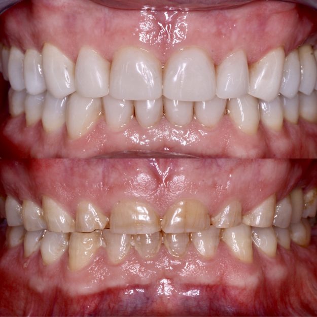 Paciente de 53 años con grandes erosiones químicas y desgastes mecánicos que se somete a rehabilitación adhesiva con composite. Realizamos encerados diagnósticos y lo trasladamos con composite a las piezas dentales sin prácticamente tocarlas. Conseguimos recuperar la función y la estética con pocas visitas. Posteriormente colocaremos una férula de bruxismo de uso nocturno de protección…