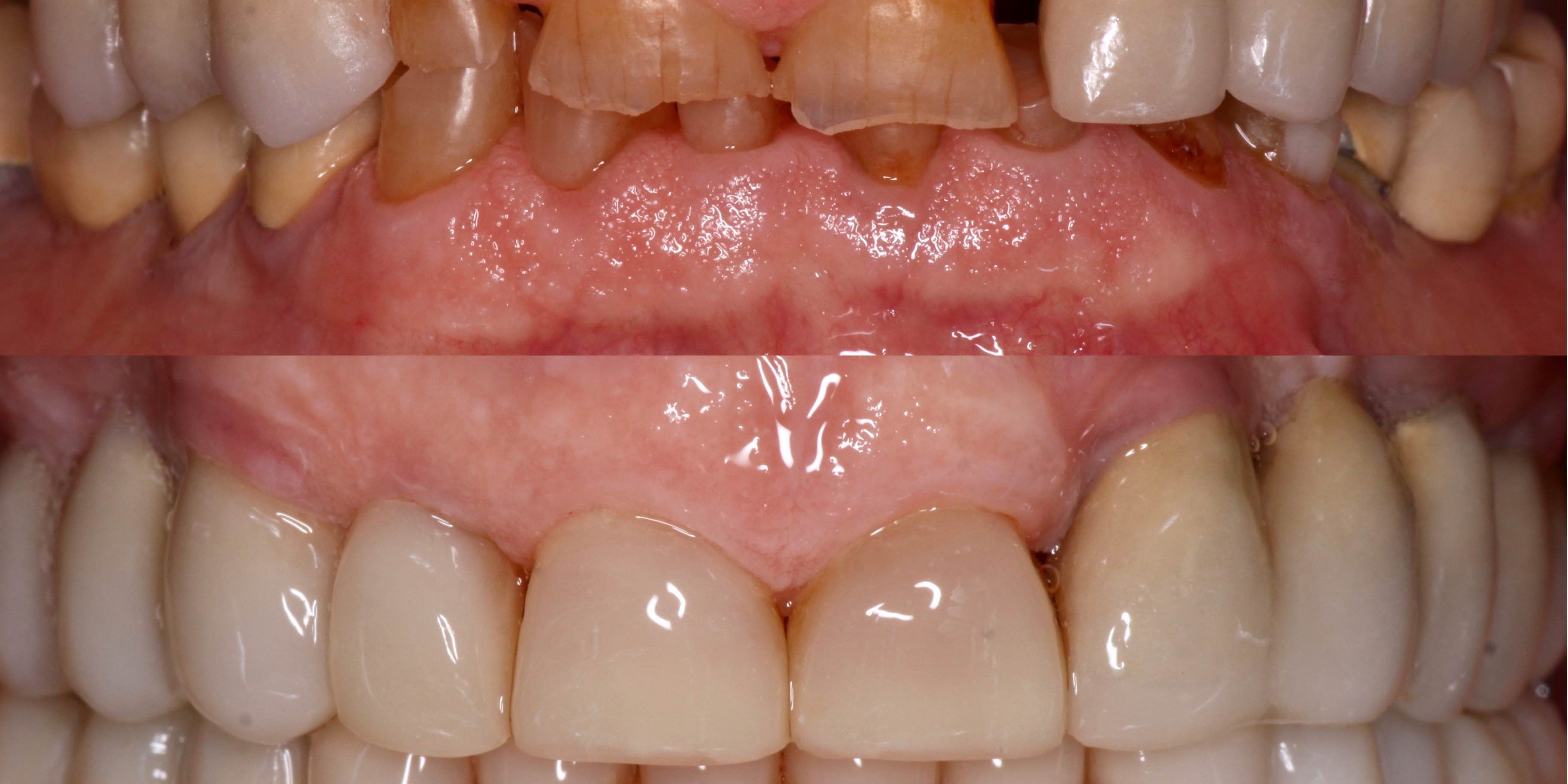 Paciente de 79 años acude a la consulta con gran destrucción dentaría y es portador de prótesis fija en zonas posteriores. Debido a la complejidad de remover todas sus prótesis a su edad y no dañar los pilares dentales se optó por hacer una rehabilitación mínimamente invasiva con composite. Los puentes suyos se mantuvieron en boca al comprobar que estaban en buen estado y se realizó un recubrimiento con composite de los mismos y de sus piezas naturales con destrucciones según las exigencias estéticas y funcionales, así como la colocación de implantes en zonas de ausencias dentales. el tratamiento tuvo unos 4 meses de duración. Posteriormente se colocó una férula de bruxismo de protección. El caso lo realizó conjuntamnte el Dr.Susín (parte rehabilitadora protésica y restauradora adhesiva) con el Dr.Plaza (colocación de los implantes)